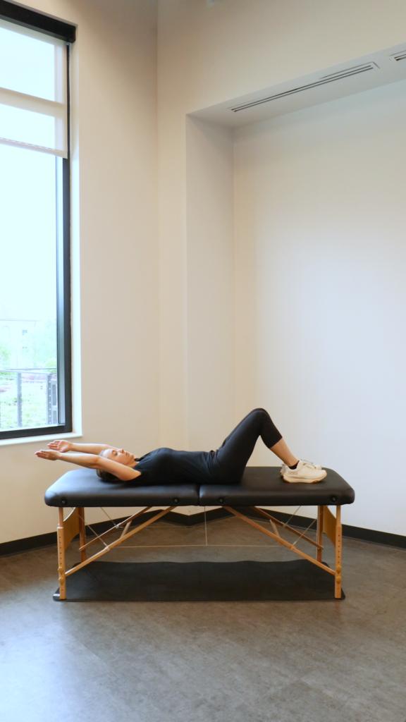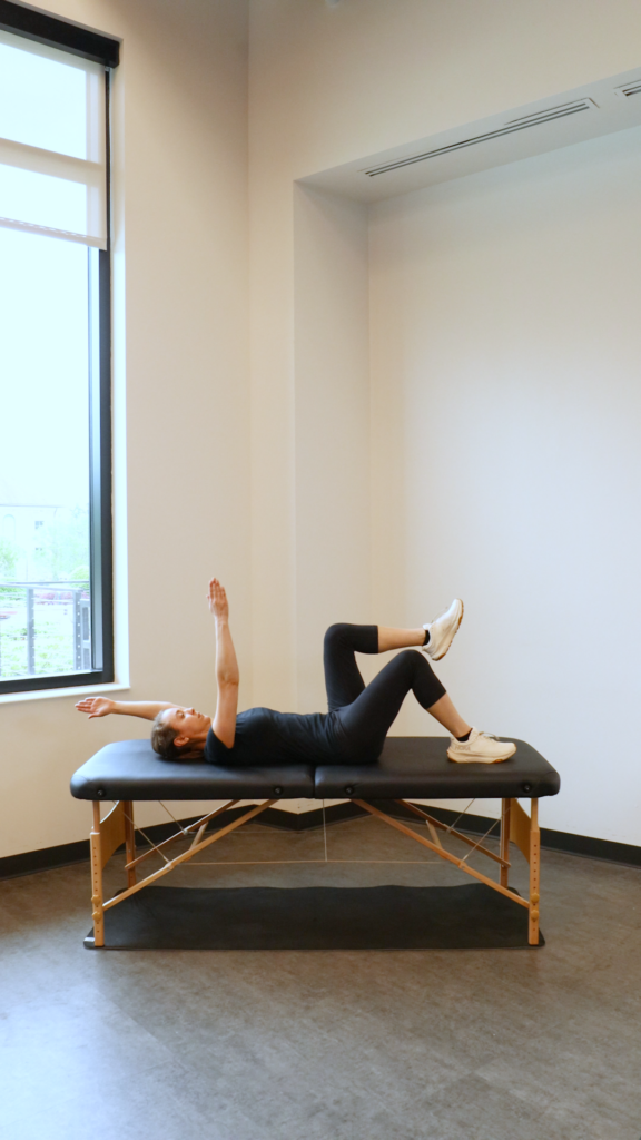 Lie down on your back with your arms by your sides, your knees bent to 90-degrees, and your feet on the floor. Raise one arm up straight and one knee up towards the ceiling at the same time. Your arm should stay straight and be pointing straight up at the top and your knee should be at 90-degrees and be pointing straight up at the top.