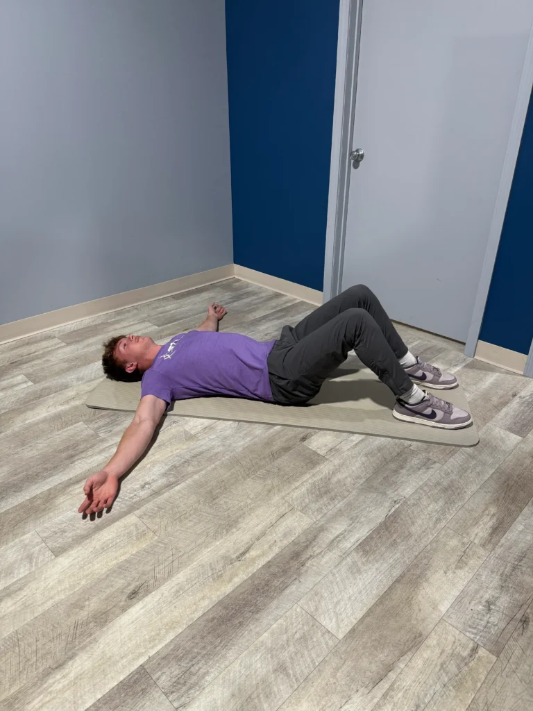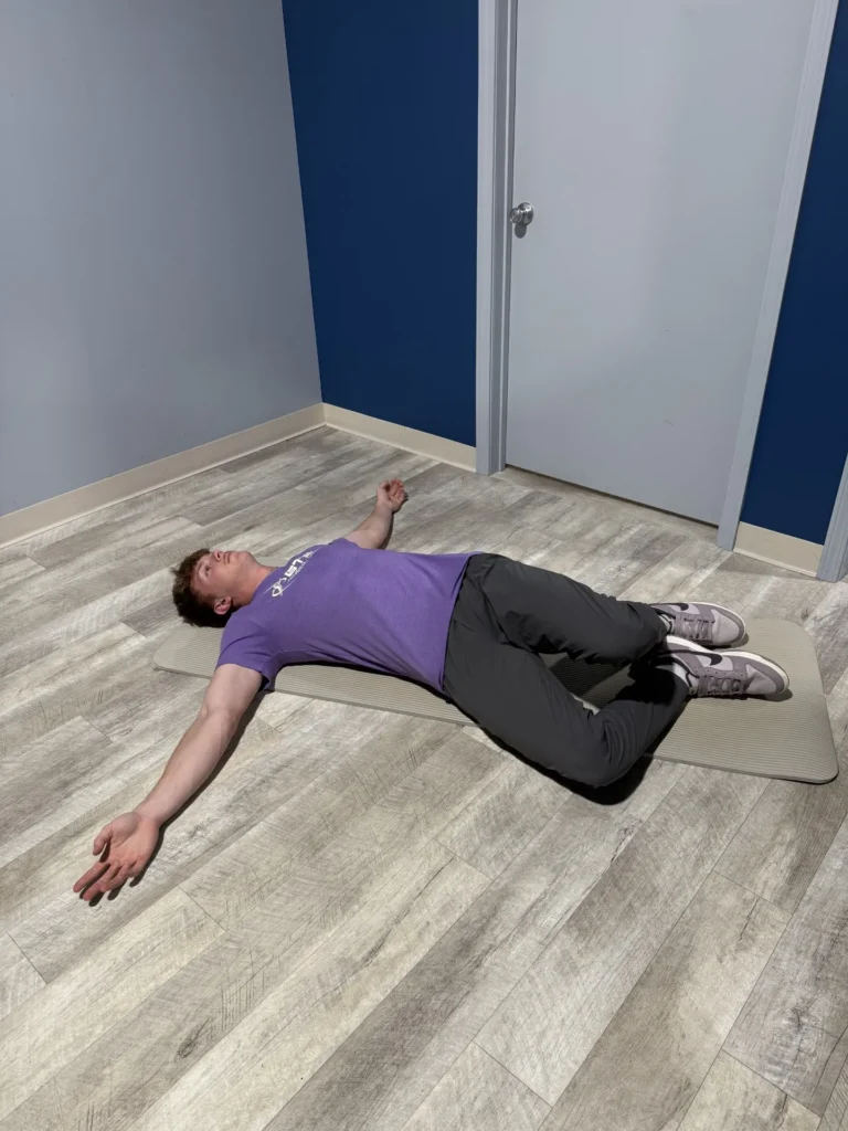 Lie on your back with knees bent and feet flat. Gently drop your knees to one side while keeping your shoulders down, then return to center and rotate to the other side. This improves lower back flexibility.